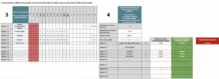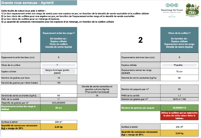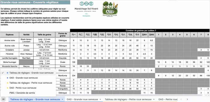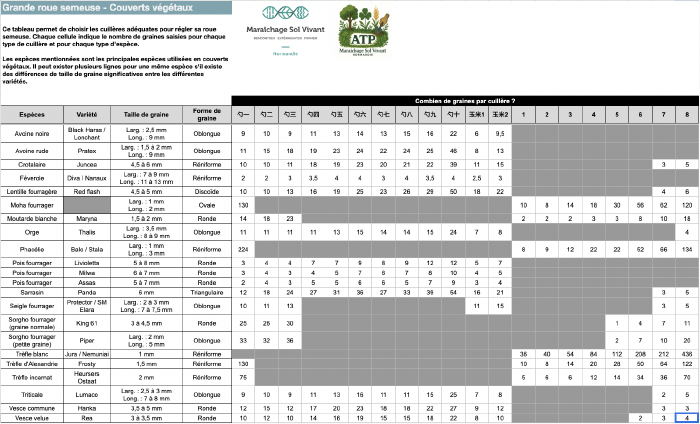 Objectif : faciliter le choix de la cuillère adaptée à chaque espèce ou mélange, pour maîtriser les densités de semis, que ce soit en semis pur ou en mélange.