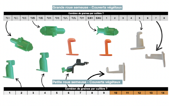 Les roues semeuses Agri Drill fonctionnent avec un système de cuillères interchangeables. Chaque cuillère détermine un volume de prélèvement, donc une quantité de graines déposées à chaque tour de roue. Le marquage de chaque cuillère (qu'il s'agisse d'un chiffre arabe ou d'un caractère chinois) permet de la retrouver dans les tableaux.