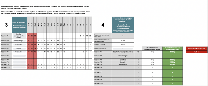 4. Calculer la quantité de semences à prévoir (en kg), selon les espèces, la surface, la cuillère et l’espacement.