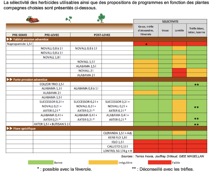 - Gestion délicate du désherbage : les légumineuses pérennes ne contribuent pas à étouffer les adventices alors qu’une réduction de dose d’herbicides est nécessaire et les rattrapages d’entrée hiver à proscrire pour ne pas les détruire.