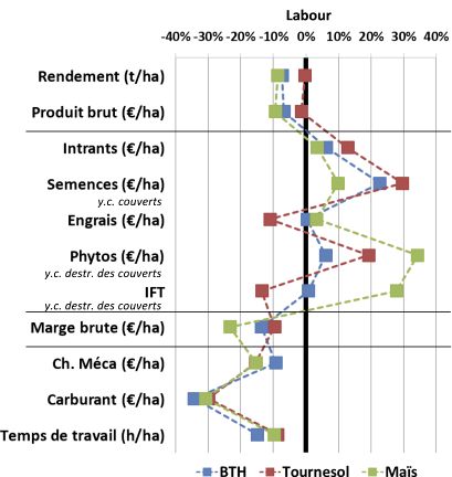 - Marge financière : D'un côté les gains des charges de mécanisation (coûts d'implantation : semis, travail du sol ...) sont réduites mais d'un autre, des pertes potentielles de rendement et des charges supplémentaires potentielles en herbicides.