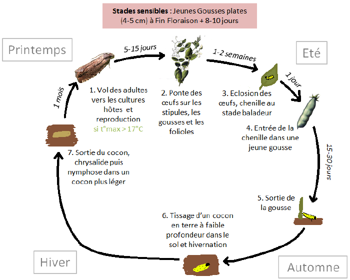 | Lutte chimique | Application de pyréthrinoïde | Efficace sur les chenilles au stade balladeuse, avant pénétration dans les gousses